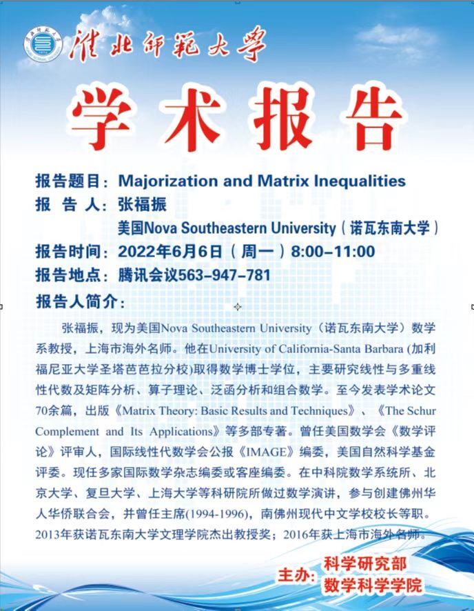 学术报告预告:组合数学与张量分析团队:Majorization and Matrix Inequalities 来源: 发布时间:2022-06-03 16:43:33 浏览次数: 次 【字体:小 大】 分享到: 【打印正文】
